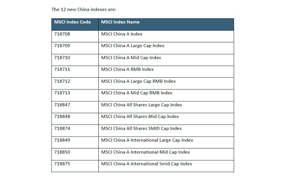3月14日,摩根士丹利资本国际公司(MSCI)公告发布12个新的中国指数,这些新指数将扩充MSCI中国全部股票指数和MSCI中国A股国际指数。