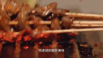 撒上辣椒粉、孜然粉,刷上热油,嫩滑的郡肝在火上“滋滋”冒油泡…老胡超快的手速,让每一寸烤肉和炭火充分接触,烟雾缭绕、香气逼人…