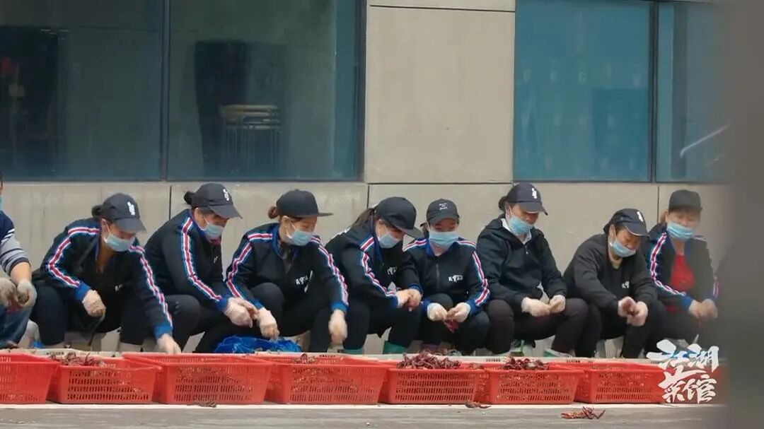 店里的小龙虾,由十几个专门剥虾的阿姨排排坐,开背、去虾线;