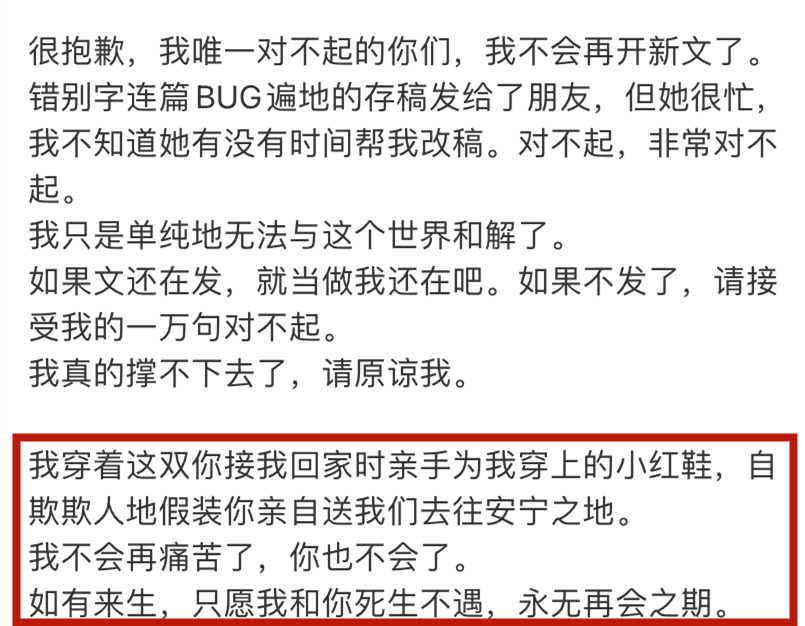 在长文的最后,她对粉丝们交代了一下自己尚未来得及发表的稿子的去向,同时也与丈夫陈某做了告别: