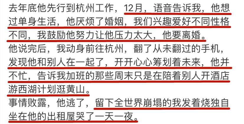 但去年12月,她发现他出轨了,那些所谓加班的日子中其实只是在陪伴着别的女人,并且和小三开心筹划着未来。