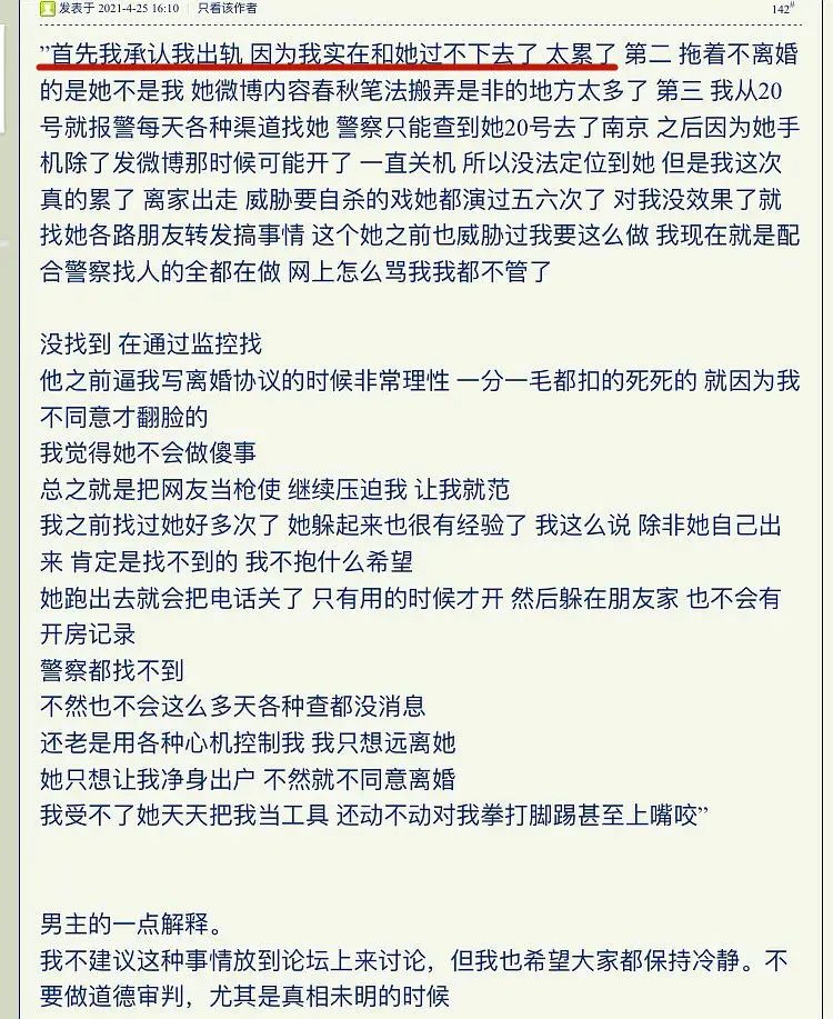他用小号回应网友的质疑,第一句承认出轨,理由是“我实在和她过不下去了”。看得我莫名暴躁。