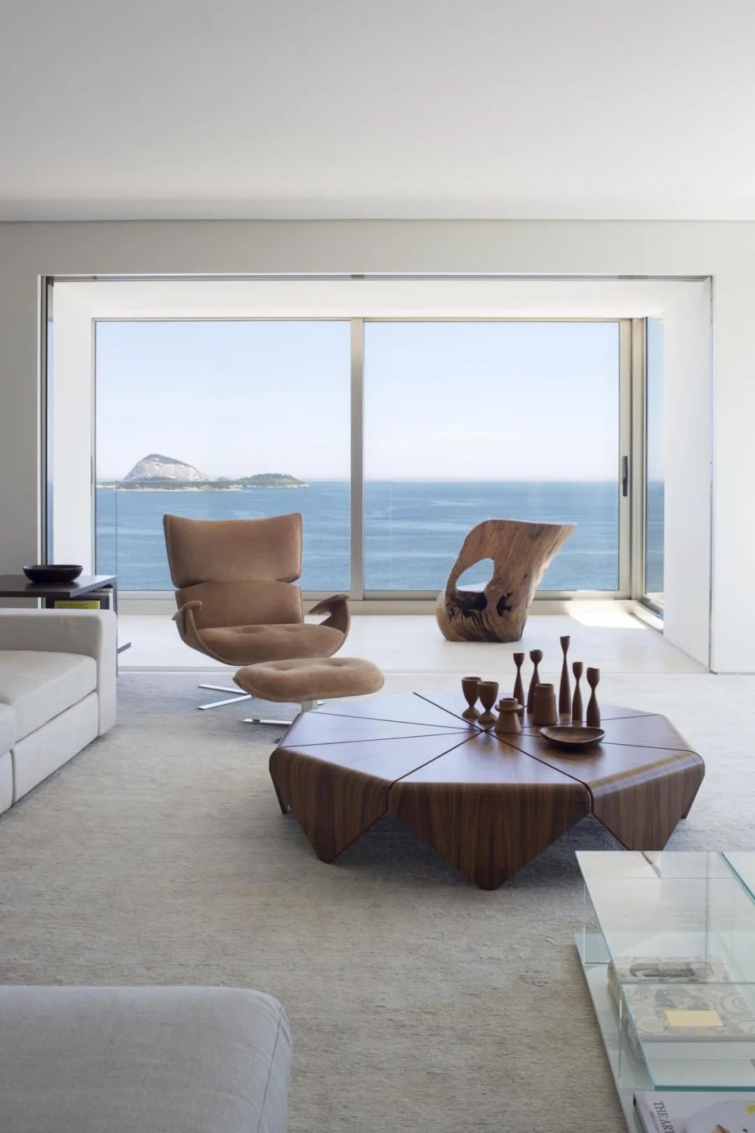 Sergio Rodrigues的本杰明椅与出自Cassina的1949 边桌以大海为背景,构成精致的容心之所,在这里,人们可以听着海风与浪花的音乐,感受静谧的力量。