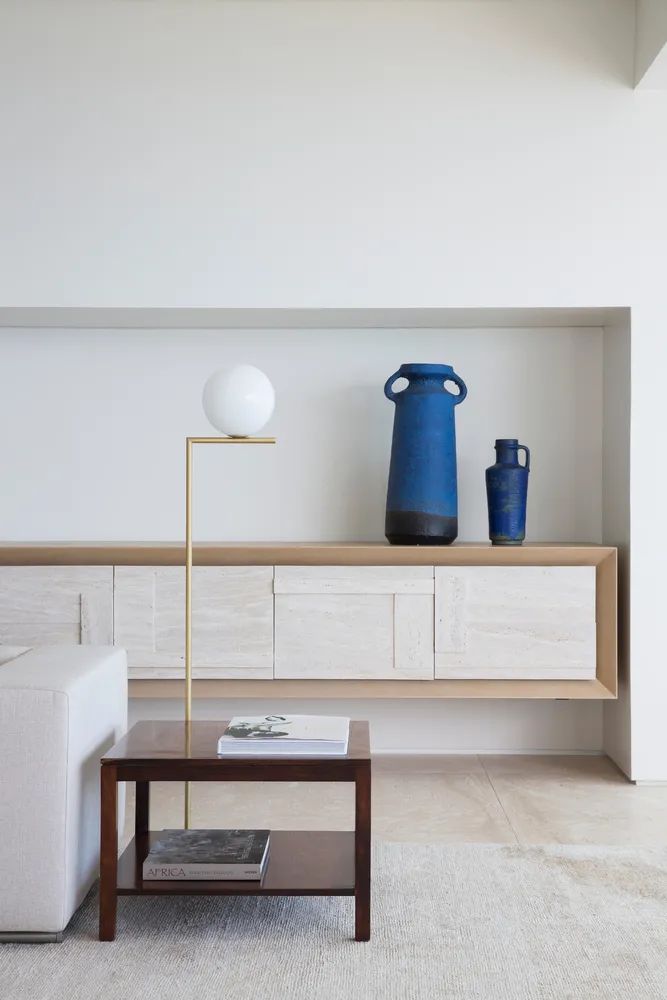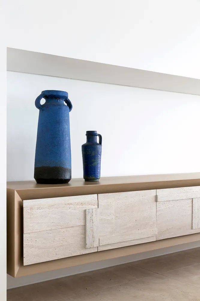 蓝色在空间中以Delfino扶手椅为起点继续飞跳,在矮柜的蓝色花瓶现身,又轻而易举地融进了Carlito Carvalhosa的画作中。