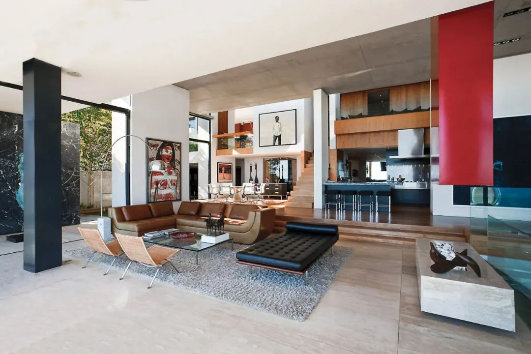 客厅中,沙发的L形以弧线顺滑收尾,极具亲切感。皮革、玻璃、藤编材质相辅相成,不同的材料赋予客厅舒适感与奢华质感。平滑的触感与地面的毡毛地毯形成视觉上的对比。