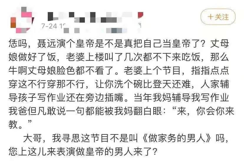 一时间聂远被骂上热搜,有人说他是演皇上上瘾了,也有人说他赚钱养家就可以当甩手掌柜的吗?我必须为聂远辩护一下,他表现得如此不讨喜,节目组的剪辑首先需要背一半锅。聂远早就承认自己有点大男子主义,从之前的很多采访也能看出来,他是一个耿直的男人,标准中国直男。综艺节目放大了聂远的弱点,别人上这种真人秀都有人设,适当的演一演,好歹让观众看着舒服点。比如何猷君镜头感超强,整天像考拉一样吊在奚梦瑶身上,言必称“宝贝”,腻歪得不行,看着一笑就行了,难不成在家里也是这样?聂远却坚持在镜头面前不表演,平时怎样就怎样,不要有任何伪装,这反而会显得很突兀。这种坚持让他难免矫枉过正,连妻子的一点小心机小任性都不允许。而且像他这样的钢铁直男,妻子那些情绪化的表现会让他很不自在,也不赞成,觉得这样是卖惨,博同情,内心不认同,也就不知道如何去安慰,显得有点没心没肺。他们家是一个很传统的家庭,男人主外,女人主内,负责赚钱的男人地位高些,连岳父母都礼让三分,这样的关系在生活中正常无比,放在镜头前,经过节目组的各种暗示,就剪成了奇葩婚姻。秦子越说聂远生活中没有这么强势,我相信也是这样,之前他上综艺分明是买菜做饭啥都会的,还能自己洗衣服,甚至会缝衣服,一直很尊重老婆及其家人,只要有时间就会陪伴家人。只能说直男的固执令人哭笑不得,一定要和观众对着干,“我俩好不好,为什么非要表演给你看啊?”我承认秦子越把夫妻关系排在第一顺位是对的,但给自己做老婆打120分,做自己打负分,这个就有点问题了。说明她除了做聂远的老婆之外,严重丧失了自我价值感。妻子关心丈夫与小心翼翼地遵从丈夫安排是有本质区别的。面对聂远对她穿着打扮的指手画脚,她明显不同意,却连一句反对的意见都说不出来,便乖乖地去换了。还有聂远的赖床,秦子越自己一直在为聂远辩护,说聂远之所以赖床,是因为有时候失眠休息不好,所以她会无条件地迁就老公。既然是失眠休息不好,让他多睡一会也正常,他们一家人先吃好了,可她不肯(或者是不敢),非要等,死等。能看得出秦子越周旋在丈夫与父母之间是很为难的,她一边觉得让父母等丈夫吃饭很不对,一边又不敢直接把丈夫扯起来,只好一遍遍地去叫,然后一遍遍地失败。窝囊得要命,看得“傅妈”直皱眉头,表情包都上了热搜。秦子越承认自己对父母充满愧疚,觉得父母这个年纪了,还要为自己的小家辛苦付出,但是谁把自己的父母扯进来的呢,还是她自己。她这个做女儿的软弱、顺从,不能做好丈夫与父母之间的沟通桥梁。在很多事情上,她都是有选择的,只是她选择了放弃权利,包容所有。秦子越自愿卑微,镜头前却放大了聂远的种种瑕疵,从某种程度上来说,秦子越“害苦”了聂远。这提醒我们,女人过于贤惠,反而容易惯坏男人,所以一定要对男人严格一点,也是为了成全他们的名节。