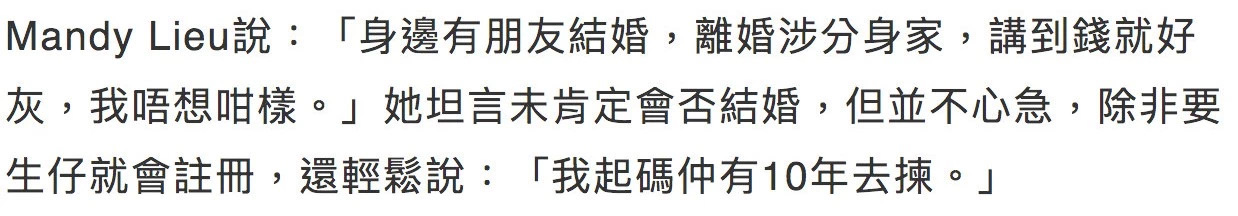 ▲ 14年3月强调婚姻更在于爱和承诺而非一纸婚约的Mandy说自己离结婚生子起码还要10年,如果有了孩子应该会考虑结婚。