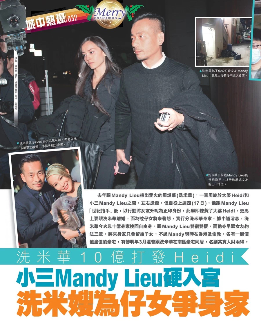 10月30日,港媒爆料称因为富商周焯华(洗米华)拒绝和原配妻子陈慧玲离婚,已经生完2女1仔的名模Mandy Lieu传说以三亿死心分手。