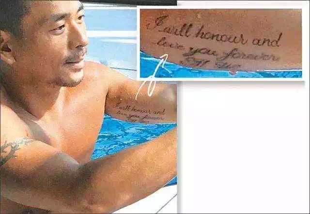 ▲  除了罕见地发声明澄清和松岗李那没关系外,洗米华更是为爱纹身。在左手手臂内侧纹“I will honour and love you forever(我将尊重同爱你到永远)”“M.W”,以M代表Mandy ,W代表Wah(华)。(这么深情的告白,还纹上身,感觉周先生对Mandy是下了一番真功夫的。)