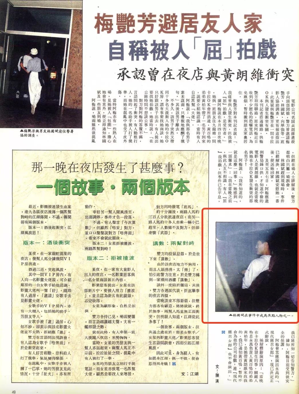 和以前对那些帅哥们的心动不同的是,梅艳芳似乎更依赖于林国斌无时无刻的照顾:跟阿Ben在一起,彼此间不须有太多的解释,也没有太多的麻烦,别看我外表硬朗,事实上我很需要一个让我倚赖的人,他关心我,对心好,每有需要解决的问题,我总是第一个想起他。「跟他走在街上,我会自觉是个女人,而且是个小(年纪)女人。」 和林国斌相处期间,梅艳芳经历了人生的低谷,电影里也讲到这一段,就是在KTV被黑帮掌掴。这件事发生在1992年,而刚才讲到梅艳芳的《亲密爱人》诞生于1991年,还不到一年的时间就情海生波。 之后梅艳芳避走泰国,过了一段销声匿迹的日子,正是由于这件事,媒体发现林国斌一直和梅艳芳形影不离,陪她上警局,梅艳芳还住在他的家里。 林国斌为人踏实,可以说是Paul的加强版,和Paul一样专情,但更有社会经验,也更会照顾人,倒是很得梅妈妈的欢心,他也是梅妈妈最中意的女婿人选,林国斌得病,梅妈妈还去为他求签。阿斌得怪病,传到梅妈妈耳里。得悉未来女婿抱恙,老人家自是担心不已。也不知何来的神通广大,梅妈妈知某寺有一位年逾百岁的人瑞和尚,于是急急把林国斌和阿梅的年庚八字奉上,一为未来女婿的怪病,二来,也为着么女阿梅的终身大事。