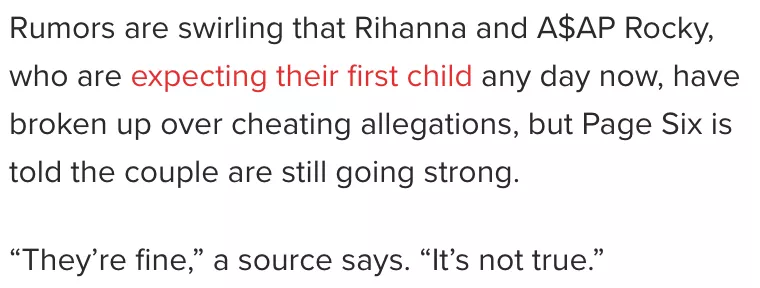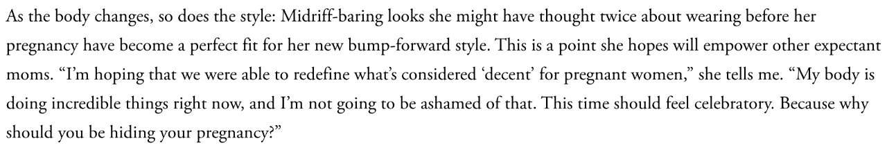 之后一个月,肚子里的新生命在冬天的厚重外套下蓬勃生长,她每次出现被拍始终神采奕奕容光焕发。终于又保密了一小会儿,1月底,Rihanna彻底敞开肚皮将孕事昭告天下。公开怀孕后,她的穿着打扮可谓是相当大胆,几乎走哪都是露肚装。▲ 她的孕期穿搭时尚我们之前专门写过一篇,点这里回顾。这种特立独行的打扮老实说是不被主流大众所接受的,各种关于肚子到底冷不冷的质疑纷至沓来,而Rihanna在接受Vogue采访时回应,她要做的就是重新定义孕妇的体面。▲“我的身体正在做着令人难以置信的事,我不会感到羞耻,而应该为之庆祝”。1991年,演员Demi Moore挺着巨大孕肚登上《名利场》杂志封面,石破天惊,激起了社会和时尚界的广泛讨论,也影响了整整一代人。如今Rihanna做的正是同样的事。▲ Demi Moore还在ins story转发了两人的孕照拼接。见过太多因为孕期身体变化只能被迫选择厚重的传统孕妇服装而无法发自内心快乐的母亲们,每分每秒都在想着快点卸货好重新开始。而Rihanna展现的是另一种怀孕态度,接纳自己巨大的孕肚,与身体发福长出的赘肉和解,想尽办法依旧保持时尚。这其中的点压根不在于她到底穿的是什么,而在于内心声音的自我表达,我的身体我自己主张,我的时尚由我来定义。3月,这位亿万富翁被拍到出现在Target的新生儿区闲逛,满怀期待地为小宝贝添置新衣。先是一位名叫Louis Pisano的时尚博主在推特言之凿凿地表示蕾姐夫A$AP Rocky出轨鞋履设计师Amina Muaddi被发现,他跟Rihanna已经分手。谣言甚嚣尘上传了整整一天,当事人三方都暂无反应,倒是几大媒体争先恐后地帮忙驳斥,强调知情人士透露他俩好着呢。