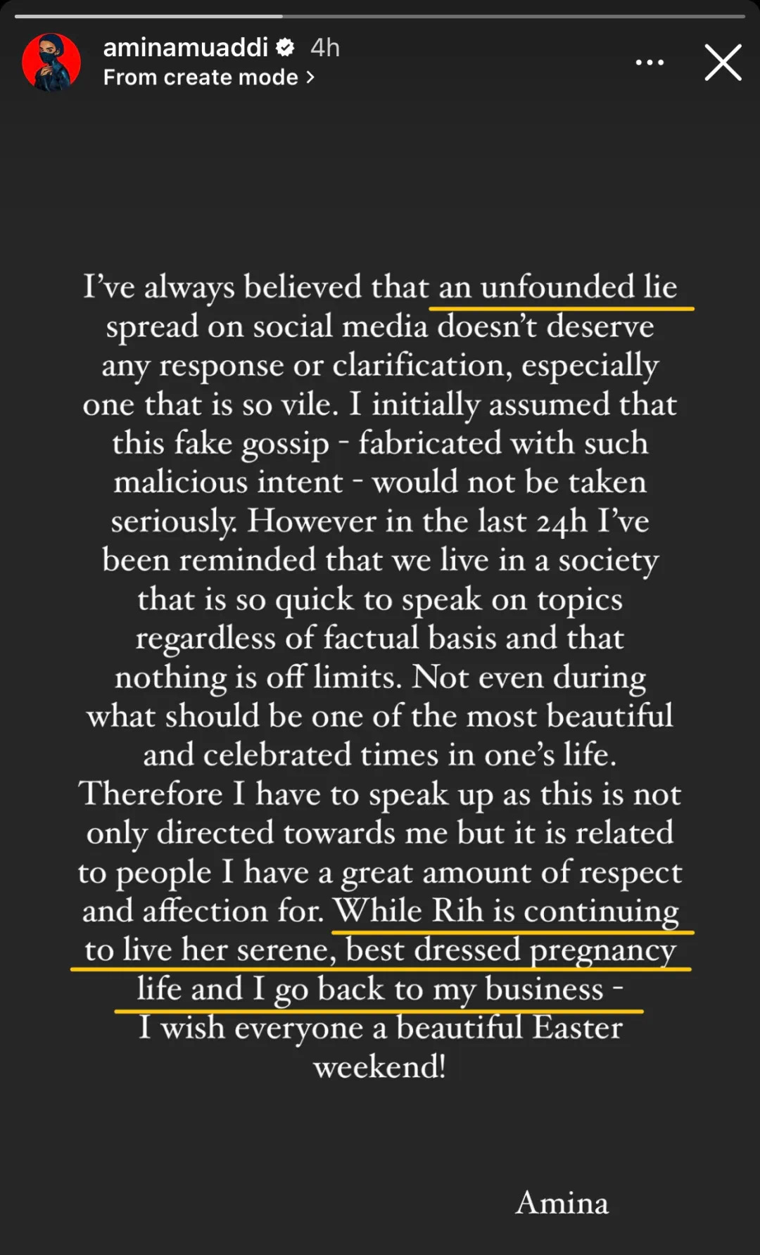 而后,被卷入的设计师Amina Muaddi率先发声。表示自己本认为这种带有恶意意图的虚假八卦不会被认真对待,然而24个小时内,社交媒体风起云涌,谣言不仅影响了她,还影响了她尊重和喜爱的人,所以她站出来主动澄清。