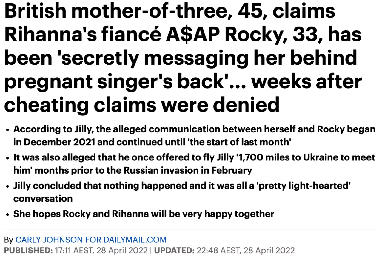 ▲ 女方名叫Jilly O'Donnell,45岁,是名站立滑板教练,三个孩子的妈妈。她说A$AP Rocky用自己的ins账号给她发私信。当然,他俩实际上什么都没发生,因为他问她,“你能来乌克兰见我么?(当时俄乌战争还没开打)”对方回复,“不能,疫情限制,哪都去不了”,不忘加一句,“首相是个没用的胖子”。短信内容看起来没有任何公开调情的字眼,双方其实也没发生实质性进展,女方在爆料之余不忘祝福Rihanna跟他幸福,但背着怀孕的女友给他人发短信,还流露想要见面碰头更进一步的意图,不免令他的忠诚度大打折扣。谁能保证在没有被曝光的角落,会否存在同样的问题呢?事已至此,粉丝们不禁痛心疾首,Rihanna的孕期也太曲折了。明明是最该放松心情的孕晚期,却被各种糟心事搞到焦头烂额,而罪魁祸首竟是枕边人。这位从岛国巴巴多斯走出来的一无所有的穷家小女孩,一步步变成万众瞩目的超级巨星,还转型为企业家,登上福布斯富豪榜,真正是白手起家的成功典范,如此成功的她,怎么还会被男人不断拖累?今天就让我们一起来聊聊亿万富婆Rihanna的故事。
