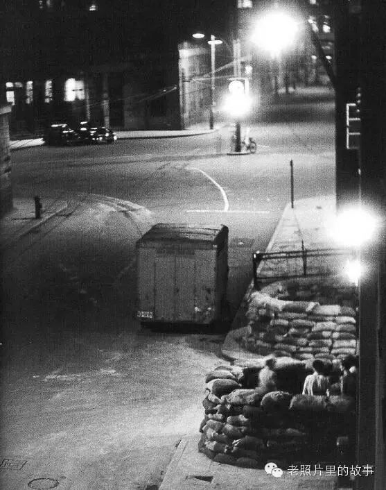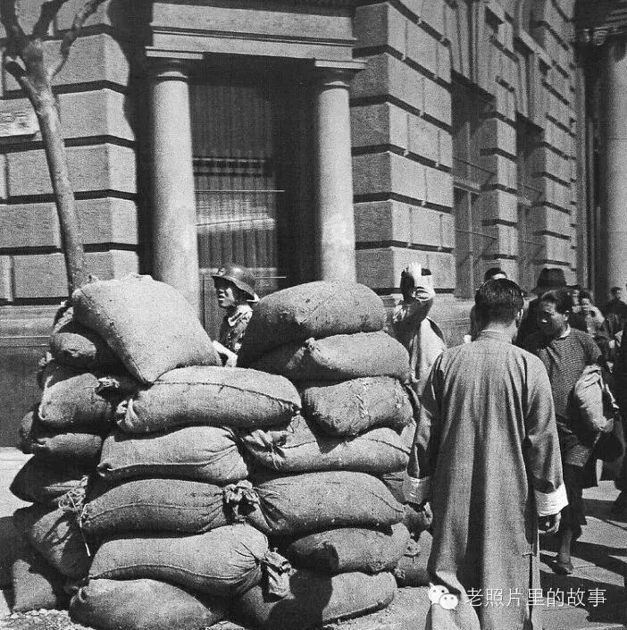 1949年5月,战事逼近上海。 一外滩银行前的沙袋和士兵。