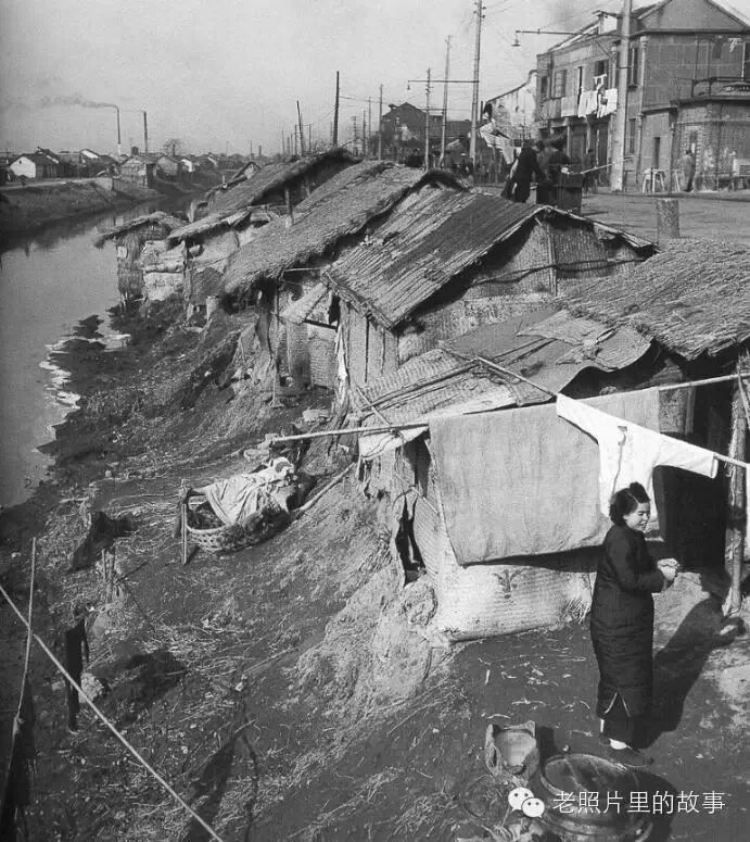 1947年12月,在河边贫民窟凉晒衣服的女人。