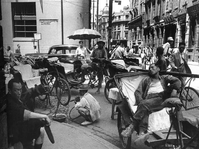1949年5月,战争阴影笼罩上海。生意清淡的三轮车和塌车。