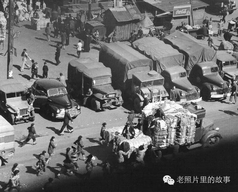 1948年3月,外滩,一群妇女儿童追赶一辆满载棉花的卡车。