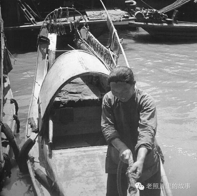 1948年3月,在苏州河舢板上晒鱼的女人。
