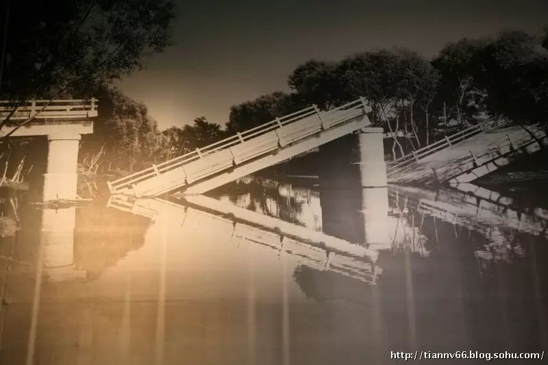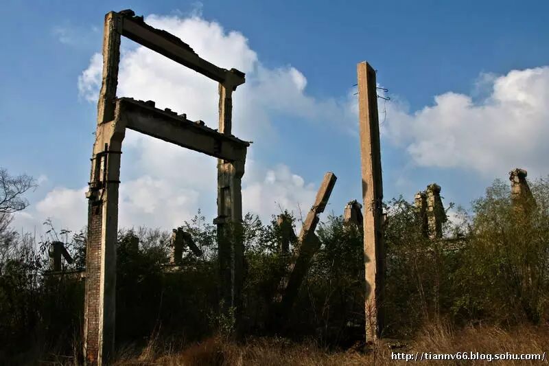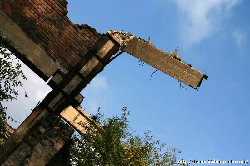 机车厂铸钢车间的震后遗址,偌大的车间顶棚整个落地,墙体全部坍塌,只剩下冷冷的,扭曲倾斜的水泥柱,让人看了心寒.