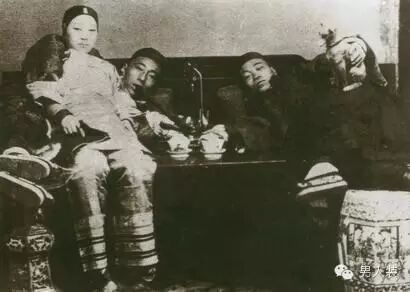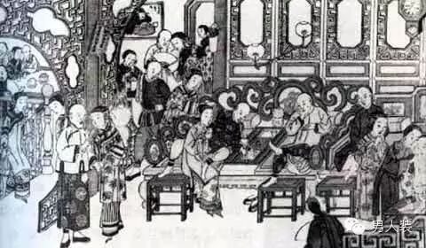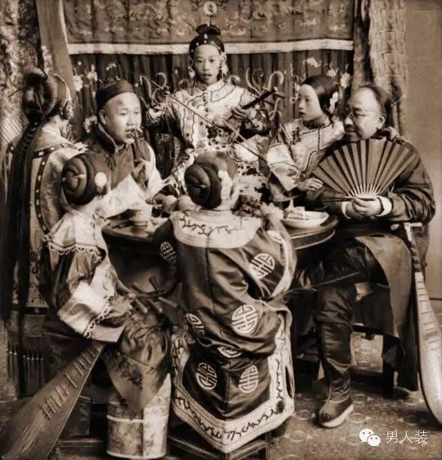 ▲1901年,广州喝花酒的富商与弹琵琶的陪酒女。