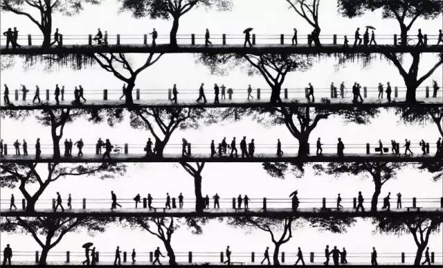 △ 1982年,清晨,雾锁珠江。早起的人们在锻炼、在赶路、在散步……(这张作品由十五张底片合成)。