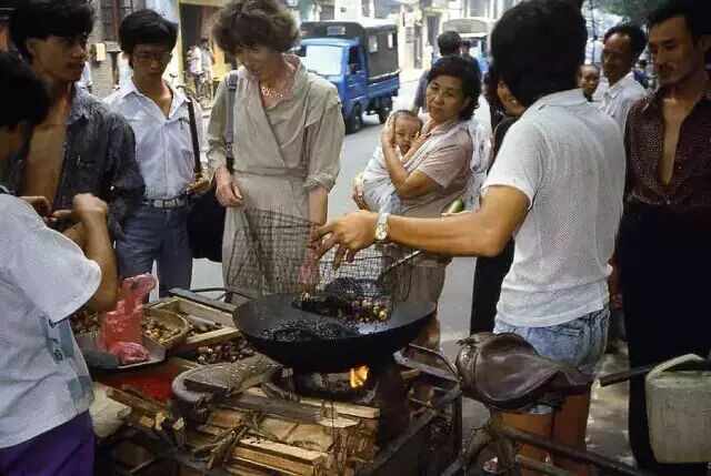 △ 1987年,广州街头一个传统的烧栗子档口吸引不少人围观。