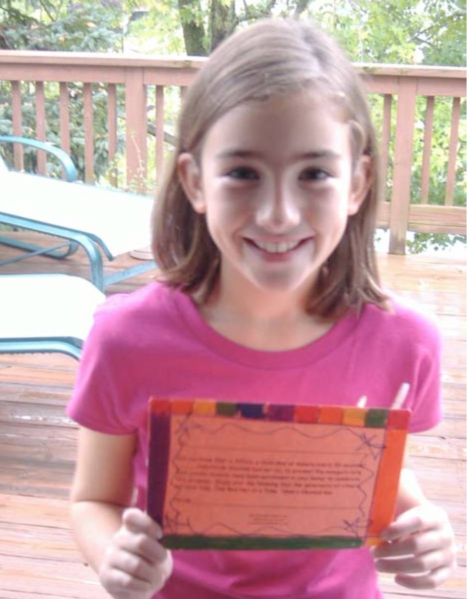 巧的是,给她找到一个“只要蚊帐”Nothing But Nets 的组织,他们专门送蚊帐去给非洲的孩子。凯瑟琳亲手把蚊帐寄过去,一个礼拜后,她收到“只要蚊帐”协会的感谢信,信里说她是年纪最小的捐赠人,还告诉她如果捐十顶蚊帐,可以获得奖状。