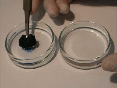 由于制作工艺有所保密,我们暂且称这种黑色材料为“海绵”。“海绵”材质具备孔隙结构和疏水功能,可以吸附自重25倍的污染物并能重复使用20次。