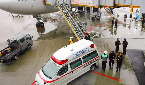 飞机于9点50分落地,但是滑行后迟迟不开舱门,当时我已经浑身汗水湿透,口干舌燥却还喝不下水,两名空姐搀扶着我来到飞机的第一排,他们告诉我,急救车已经在外等着我了。我把电话留给了空姐,告诉她我的托运行李没法取了。我说我是单身乘客,没家属在身边。