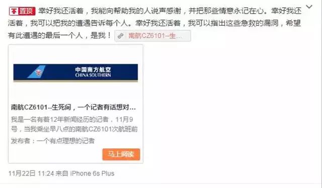 11月22日,网名为“一个有点理想的记者”的辽宁某记者成功地为南方航空公司制造了一场公关危机。他描述自己9日一段亲身经历的文章被疯狂转发,22日中午阅读量就超过600万,而23日中午南航发表的《情况说明》转发量只有记者文章的16%。尽管23日下午南航北方公司副书记上门致歉,此事24日仍登上各大新闻网站,特别是23日知名微信公号“假装在纽约”发表了阅读量破10万的“为什么美联航愿意推迟起飞等一个普通的乘客”后,中国整个航空乃至医疗服务业的问题被摆到了聚光灯下。