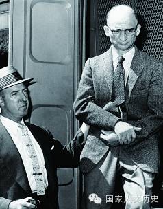 1957年8月13日,鲁道夫·阿贝尔(右)以涉嫌间谍罪的罪名,被美国联邦调查局押解到布鲁克林的联邦法院