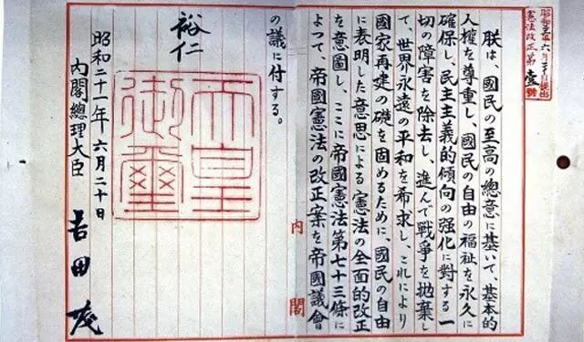 还没有弄清到底发生了什么事的吉田在看过GHQ版宪法草案之后,脸色变得十分苍白。天皇将不再是国家元首,只是日本的象征……草案中还有许多超乎当时日本人想象的内容。