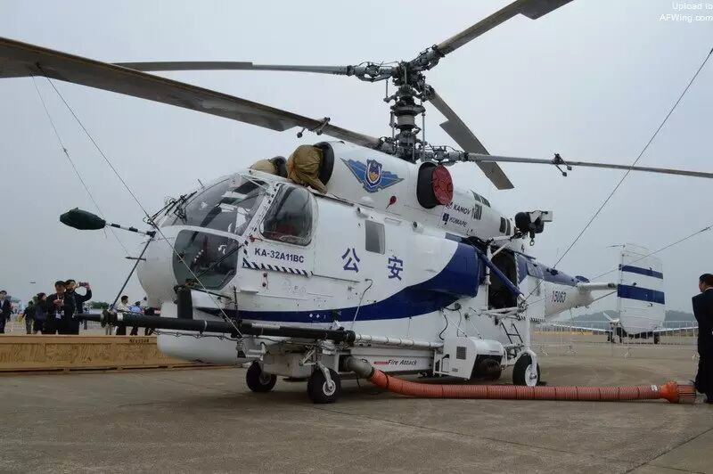 45 珠海航展上展示的卡32直升机,下方就改装了消防水箱,那根橙色的管子就是野外水面悬停再补给的抽水管