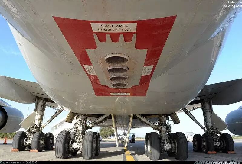 43 747特种消防飞机机腹的投放口,这飞机一次能装载2万加仑的消防化学药剂,但是因为不是水上飞机构型,只能返回基地着陆后进行补给