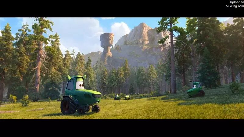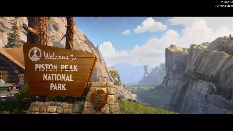 主角来到活塞峰国家公园的时候,我想熟悉地理和爱好旅游的观众都会笑起来,因为这就是黄石、红杉树、拱门和布莱斯峡谷等等美国国家公园们的集合翻版。在这里面不仅出现了红杉树国家公园很标志性的可以穿越汽车的红杉树(图24),还有黄石国家公园标志性的“老忠实”间歇喷泉和有着巨大落差瀑布的黄石峡谷(图25),峡谷里还汇集有拱门国家公园的风化石拱,还有布莱斯峡谷国家公园的风化石柱(图26系),而且连影片中的森林酒店都有现实原型可以对照——就是黄石国家公园里著名的“老忠实”酒店(图27),不知道对于这种隐藏广告,估计老忠实酒店或者美国国家公园管理机构得给了制片人不少支持和赞助(图27系),呵呵。当然,艺术来源于生活,高于生活,这里面就有不少搞笑的地方,比如可容纳车辆穿越红杉树上居然有一个可以穿越飞机的树洞(图28),杉树上的鸟窝里面的画眉鸟是一大两小橡筋动力自由飞航空模型(图29),这和本片第一部中恒河上的鸟是滑翔机模型的笑点如出一辙啊,黄石国家公园里的麋鹿都化身成了拖拉机,大家甚至可以通过顶棚的车灯架来判断麋鹿的雌雄特征(图30),这些笑点同样出现在了影片里酒店里陈列的野生动物模型上,然后大家还能看到瀑布附近的拱桥,拱桥的桥拱又一次应用了汽车钢板弹簧的笑点,与真实不一样的是这个拱桥出现在了瀑布的下面,真实世界里这个拱桥是在黄石大峡谷“上瀑布”的上游(图31系),而活塞峰的那个像活塞的一样的山峰原型估计就来自于布莱斯峡谷国家公园的岩柱了(图32)。