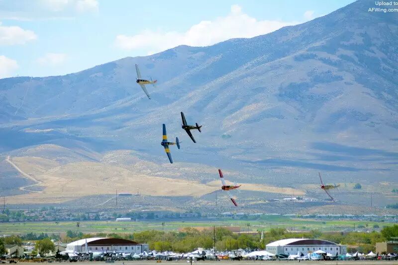 04 2014年参加雷诺飞行竞赛的T-6机群,大家都在大坡度转弯,飞行高度也很低,同一机型飞行比赛更加公平,完全比拼的是飞行技术、团队力量