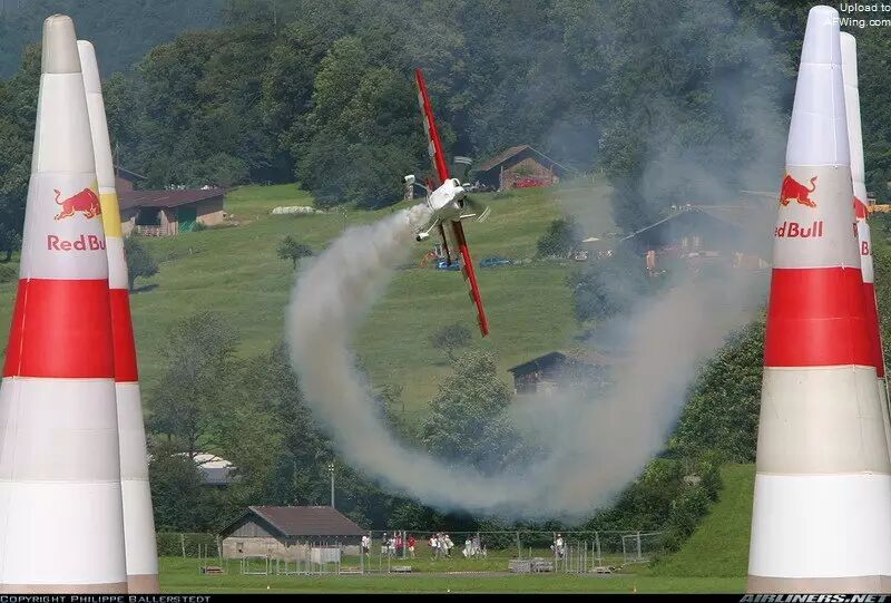 另外一项赛事就是RED BULL AIR RACE,中文名“红牛飞行特技世界锦标赛”(图06系),该项赛事是从2003年开始的,既然叫世锦赛,那也就清楚的表明了红牛赛和雷诺赛的不同,前者是在世界范围内选择场地来进行,后者就一直固定在雷诺机场举行,红牛赛和雷诺赛的另外一项区别是飞行的技巧和要求,虽然大家都是在闭合的航线内比赛飞行速度,但是红牛赛不仅仅只是像雷诺赛那样简单的同方向绕飞地标很多圈,而是需要穿越由多个高20米的气柱组成的“气柱门标”并且完成闭合航线的竞速竞技,首先,这个飞行路线很复杂,飞机随时要改变飞行方向,其次,为了增加飞行难度、观众看点和评判标准,赛事制订了了很多穿越规则,比如遇到红色的气柱门就必须以侧飞的“刀锋”的动作(就是大翼所在的飞机横轴与天地线正交90度的侧飞方式)来穿越气柱门,而遇到蓝色的气柱门则必须以平飞的方式来穿越,飞越的高度有严格的限制,过高、过低、划撞气柱、遗漏穿越气柱门、飞出比赛规定空域以及将飞机飞出12G的过载等危险动作都会被罚分甚至是直接取消比赛资格。由于红牛赛的可看性更强而且举办地相对灵活,所以红牛赛的观众正在与日俱增,这两项世界顶尖的航空竞技活动的高难度和竞争的激烈,诸位读者都可以在微软飞行模拟中来直接感受。