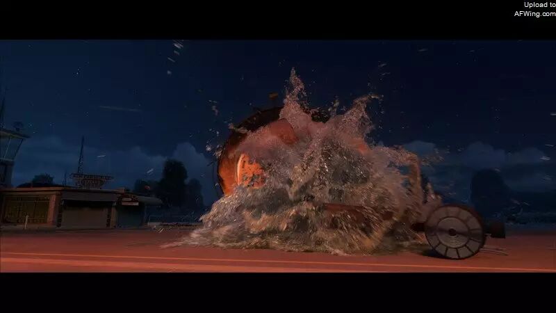 现在大家都知道火灾可分为五类,A类火灾是由含碳可燃物诸如纸张、木材、棉、毛等固体可燃物造成的,针对此类的火灾往往使用水基消防器材进行扑灭;B类火灾是由可燃的液体类诸如汽油、酒精、香蕉水等造成的火灾,针对此类火灾往往使用沙土、干粉、阻燃泡沫以及二氧化碳灭火器扑灭;C类火灾则是由可燃气体诸如乙炔、甲烷、天然气等引发的,扑灭此类火灾应使用干粉、卤代烷、二氧化碳灭火器;D类火灾则是由可燃金属诸如钾、钠、镁、铝粉造成的,扑灭此类火必须用沙土来隔离氧气;还有E类火灾则是因为电器电路发生了短路、跳火等故障造成的,对于此类火灾必须使用卤代烷、干粉以及二氧化碳灭火器进行扑灭。根据以上我们可以轻松地判定影片中出现是属于B类火灾,应该使用专用的消防阻燃泡沫、防火沙土进行氧气阻隔、降低火点温度、阻止燃烧物移动和缩小燃烧面积救援处置,而在影片中使用水来消防的处理不仅不能安全的灭火,反而因为油比水轻会造成可燃物漂在水面上随着水流四处移动,这样火灾不仅没有扑灭反而会扩大(图17系),因此当TMST的消防检察官(他可是一辆专业的机场消防车——这种车辆可以用消防炮喷水也可以喷洒专用的消防泡沫,大家平常很难看到,他们往往更多出现的时候反而是在迎接新飞机加盟机队时的水门洗尘典礼上,图18系)质询小镇的消防员“紧急”MAYDAY(该词来源于“帮帮我”的法语,英文发音为Mayday,与“五月一日”的英文发音一样,这是国际上通用的紧急情况的专用无线电通信语言,使用时应先连续说三次Mayday,然后在通报自己的交通工具型号、位置、故障原因以及求助要求)的时候,我想很多在消防阵线的战士们都会笑出来的。