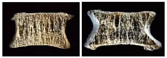 ▲正常骨骼(左)和骨质疏松骨骼(右)