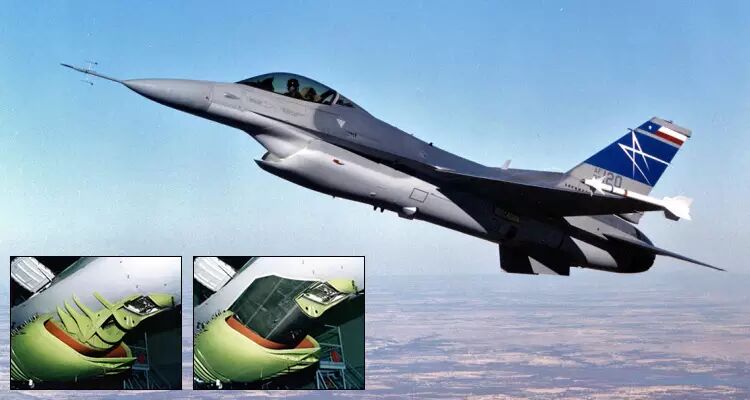 F-16原先的进气口模块上表面形成了机身前油箱底板,该油箱位于驾驶员正后方。这个油箱底板成为新进气口模块结构布置的理想起点,因为能从F-16生产线直接获得这个组件。新进气口保留了隔道支撑结构,结合油箱底板,形成了新进气口模块与前机身组合起来的主要手段。