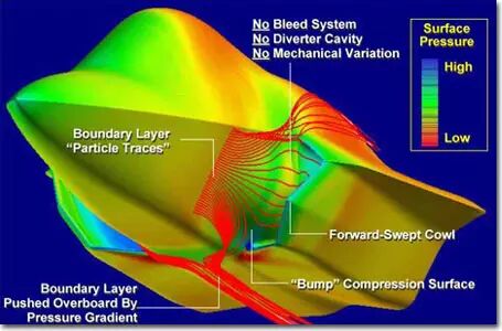 洛克希德·马丁公司F-35战斗机机身两侧进气口内不起眼的鼓包实际上堪称空气动力学奇迹,而这只有航空工程师能够充分理解。在F-35以超音速飞行时,这种进气口的鼓包与前掠式进气口唇口配合工作,使有害的附面层气流远离入口,可以完全取代目前战斗机所使用的更重、更复杂、更昂贵的带附面层隔道的超音速进气口。