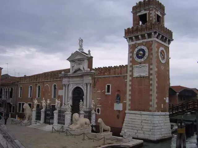 所有这些海事活动的中心,是这里的军工厂。它宏伟的正门上饰有许许多多的雄狮,站在门外,就好像望见了一个中世纪的奇观。1500年以前,这片方圆60英亩、被高高砖墙围起的地方,是世界上最大的工业建筑群。在这里,威尼斯人建造并修理所有海上贸易和海上战争所需的东西。军工厂生产的东西,除了商船和战船,还有绳索、船帆、火药、船桨和大炮;所使用的方法领先于时代数百年。他们分析生产过程的每一个阶段,并把它分解成段,就像现代流水作业的原型。精于各个组成部件的工匠们,以成套元件的方式建造船只,这样,在危急时刻,人们就能以闪电般的速度组装好船只。军工厂的工人们,曾经用一场宴会的功夫,组装好一艘完整的战船,令来访的法国国王大为惊叹。