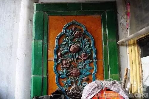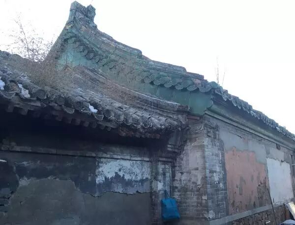 我在大门和前院左右踅摸,找不到所谓的山门,也就见不到传说中山门伫立的雕塑——枣红立马。因为是该庙祀奉的是关羽,枣红马应是其坐骑——“赤兔马”,百年过去,主神和他的马早已不知何处,但东路院落所谓“正殿绿琉璃瓦顶,山墙及坎墙用花琉璃砖砌成”依然还在,与记录相符,流露出当年的阔绰华丽。房檐上的琉璃吻兽也是有所残缺,而坎墙更惨,除少数残存,大多漂亮的绿色琉璃砖不是被抠下来或者就是失修剥落了。