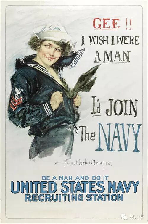 一战期间,伍德罗·威尔逊总统为了掀起爱国狂热并鼓动年轻人参军,一手创建了画刊宣传部(Division of Pictorial Publicity )。其中一幅给力的作品当属这幅《女水兵》,图片上用醒目的字体标注着“如果我是爷们,定要参加海军。”和“是爷们儿,就参加海军。”的宣传语。