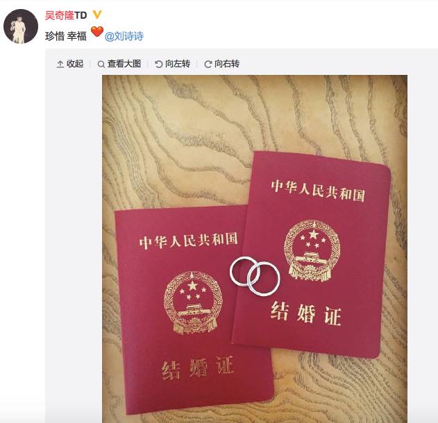 5月27日,黄晓明在微博上晒与baby的结婚证。