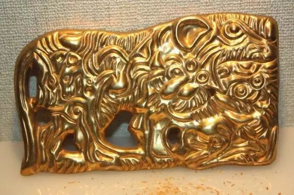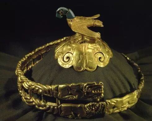 ▲ 内蒙古杭锦旗阿鲁柴登匈奴墓出土的战国时期匈奴金冠,冠顶底座半球形,顶心立一金鹰,绿松石雕成鹰首,上嵌黄金双目。头和尾部是金丝穿缀,可灵活摆动。半球座上的纹饰为四只大角卷曲的羊在四只饿狼噬咬下挣扎。冠带两层箍体上装饰着老虎、大角羊、马等极具草原文化的粗旷图案。