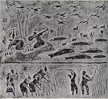 ▲ 汉画像砖表现的典型农村产业图像:耕种收获农作物,农闲射猎和养鱼