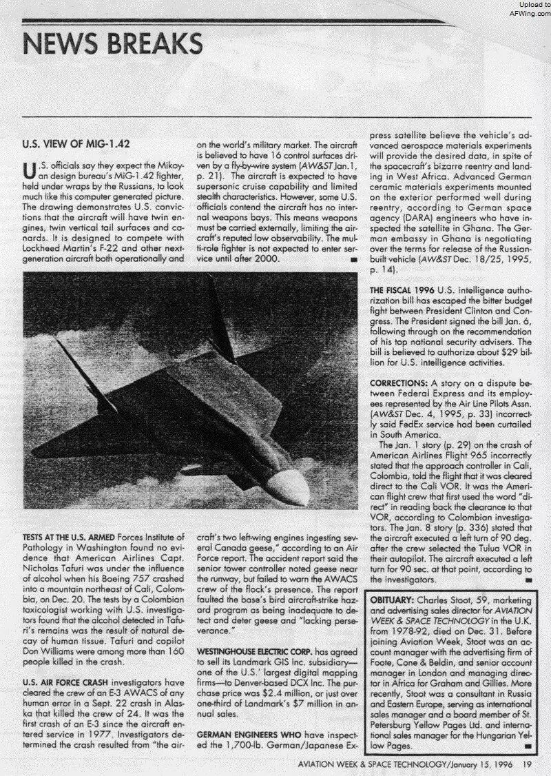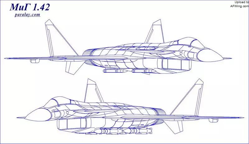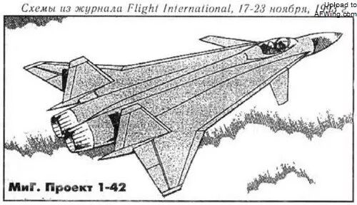 需要指出的是,未来的MFI生产型(“产品1.42”)与验证机相比在某些方面会出现变化。首先进气口需要重新设计,新进气口类似与1962年米高扬E-8实验机的,具有V形平面轮廓和与垂直隔板整合在一起的垂直气流控制斜坡,这样设计可以降低雷达反射面积,而且米高扬工程师们担心1.44的水平斜切进气口会在剧烈机动中导致一侧发动机喘振或熄火。其次,由于生产型将安装火控雷达,机鼻也会从平底椭圆截面变得更圆。第三,1.42将增加空中加油管。最后,生产型的机翼平面形状也会稍有不同。