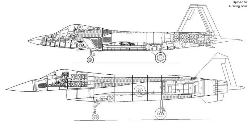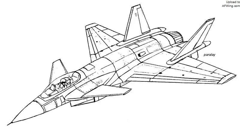 双垂尾间距很宽,不禁让人联想起F-22大幅外倾的垂尾。垂尾安装在发动机舱两侧细长的椭圆形尾撑上,下方对应着大尺寸无外倾腹鳍。前文已经提到,MFI是第一种使用可动腹鳍的战斗机,腹鳍后半部分可作为方向舵使用。MFI还有一个与众不同的特点,尾撑和发动机之间连接翼面的末端有小型升降舵,可辅助鸭翼进行俯仰操控。