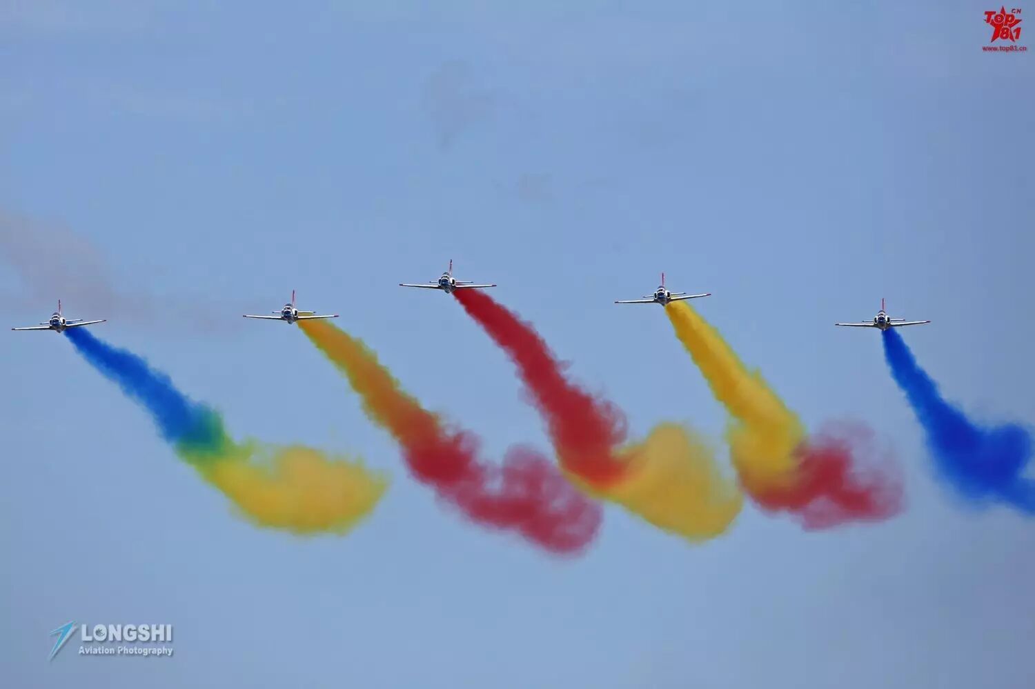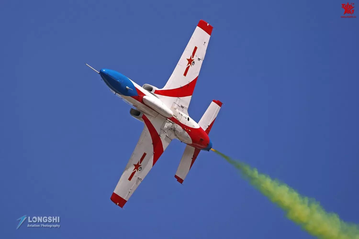 “红鹰”的拉烟不仅浓密,还能在飞行中变化颜色,这是我国的第二代环保彩色烟剂